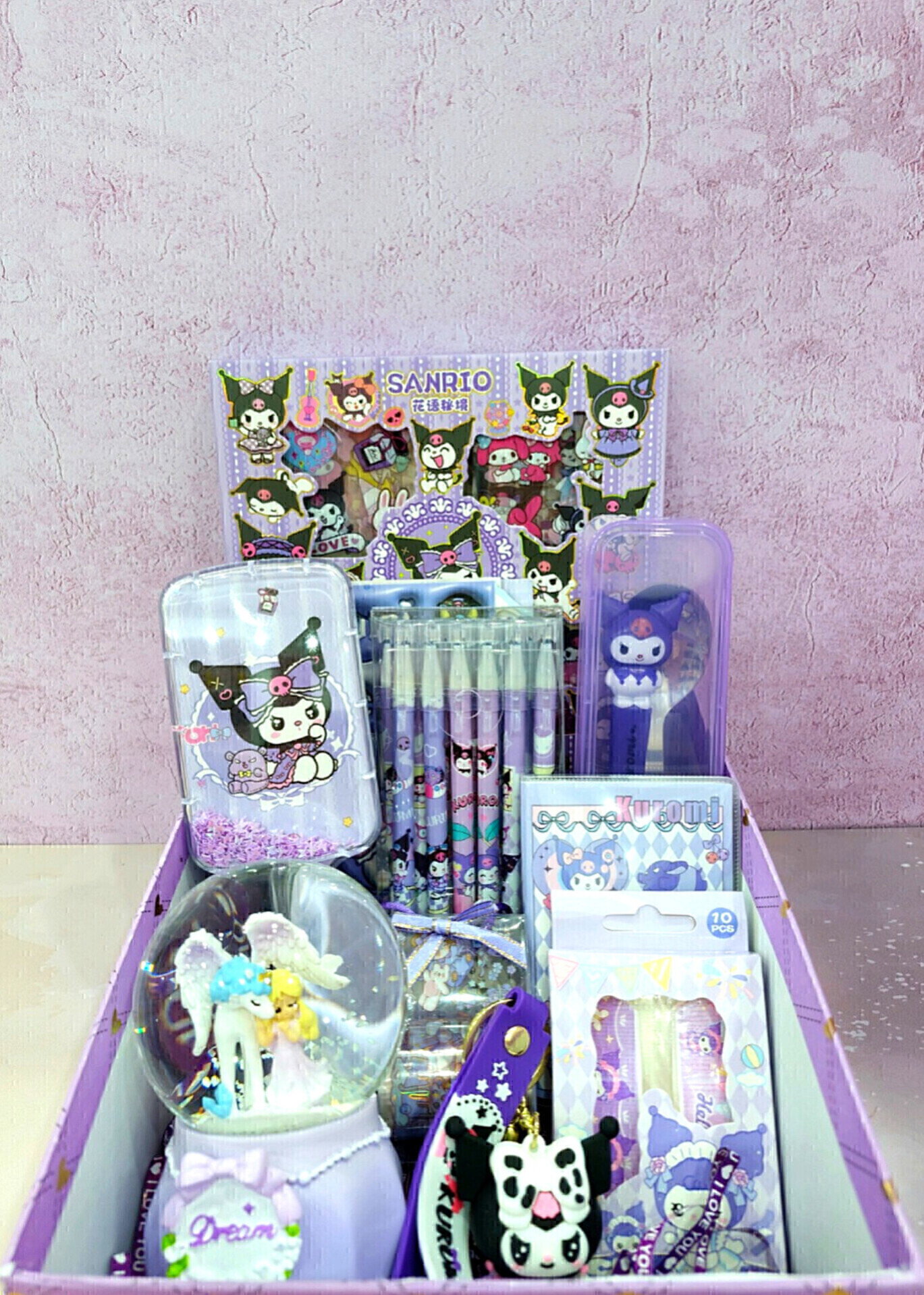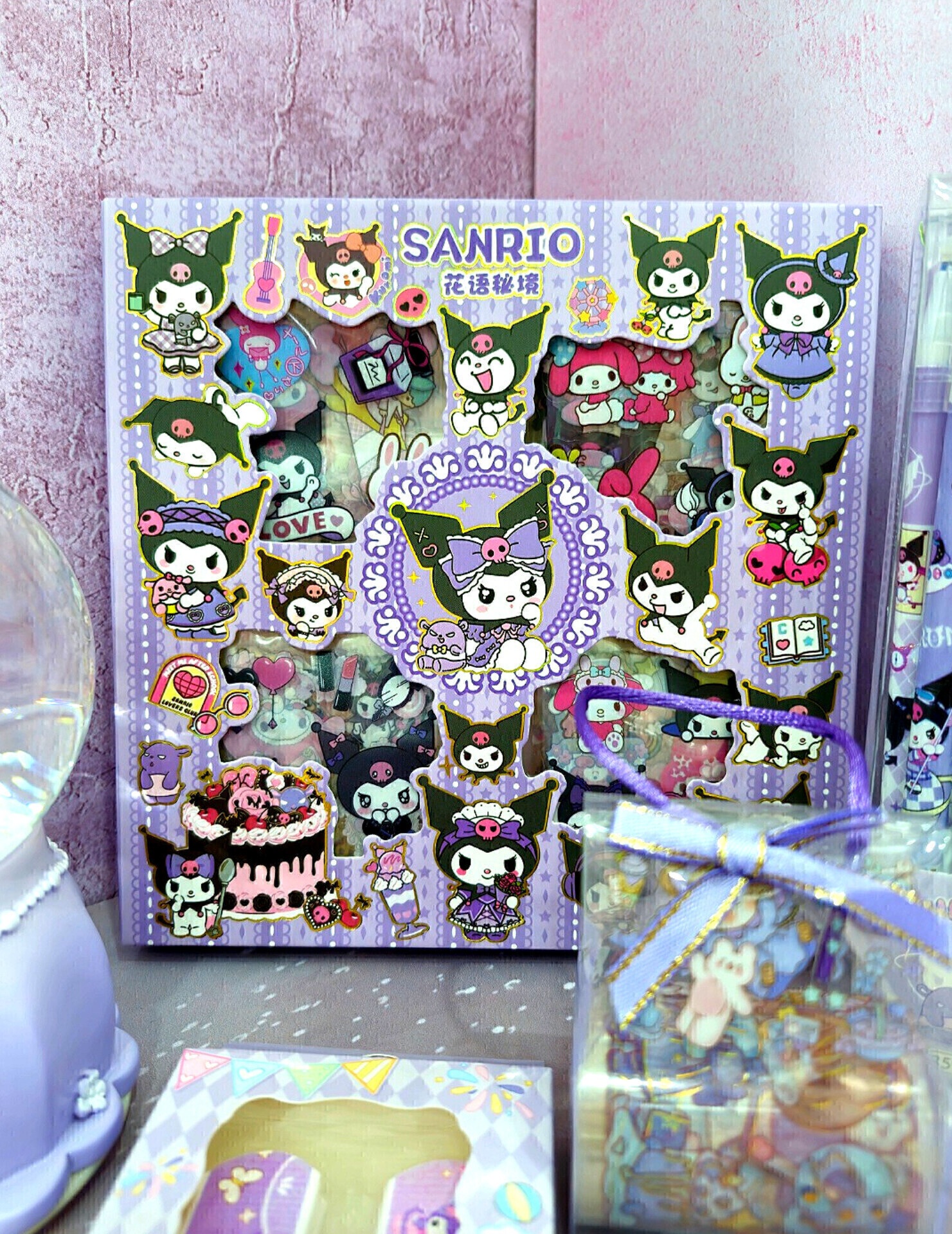 8-دفترچه و پک استیکر (چند ورق استیکرسانریو از دو مدل جنس کاغذی و طلقی داره و همچنین دارای برگه ی یادداشت طرح دار برای نوشتن است )