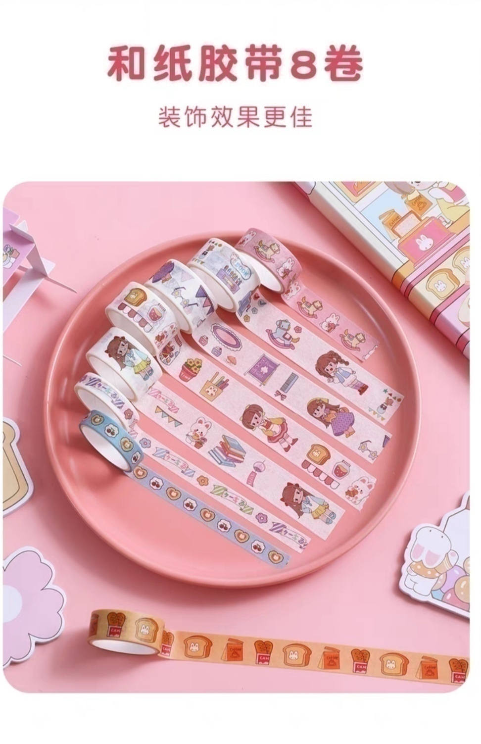 5- 8 عدد چسب واشی با طرح های مختلف و اندازه های متفاوت پهن ، باریک و متوسط مناسب برای هر نوع استفاده در هر قسمت از دفتر یا وسایل