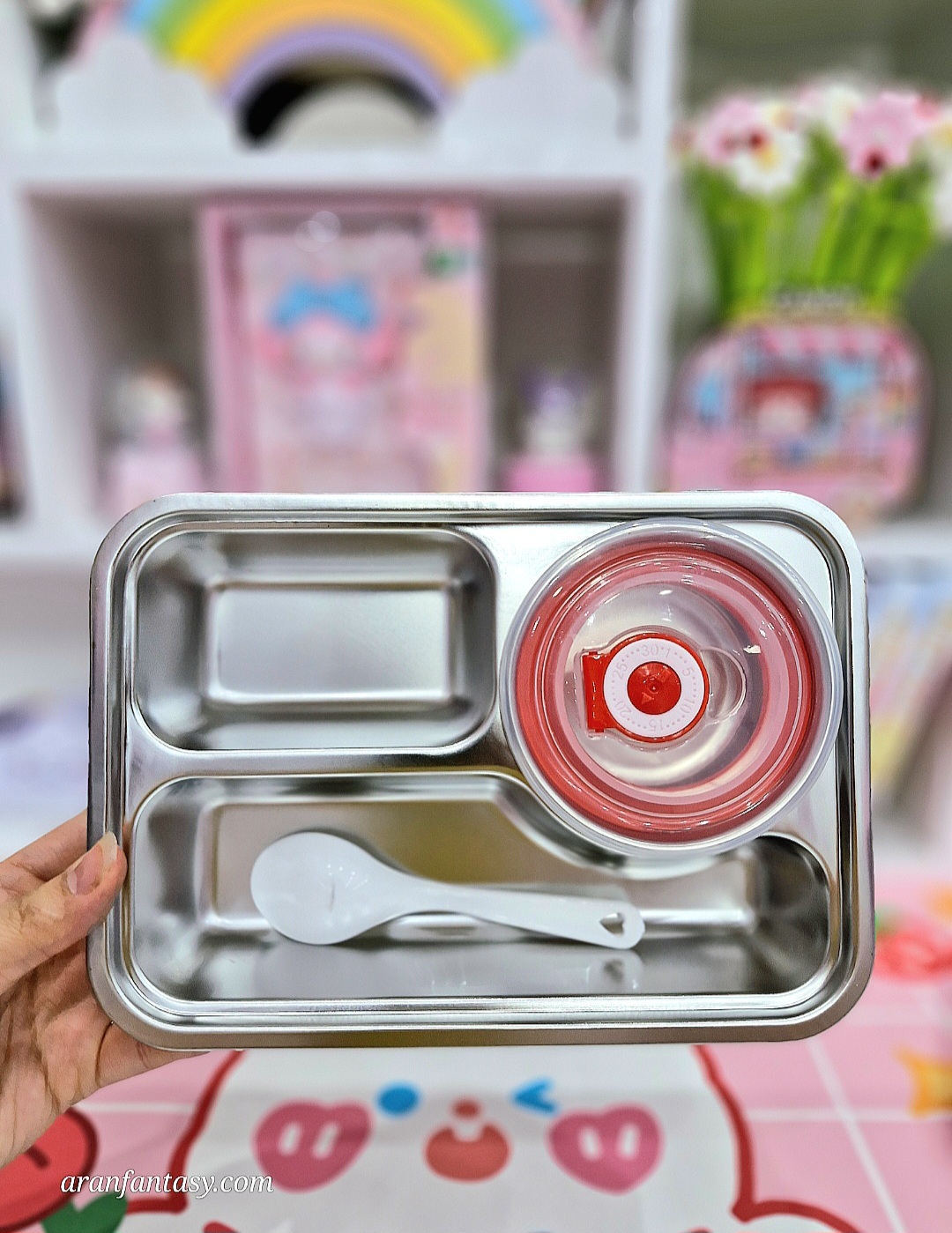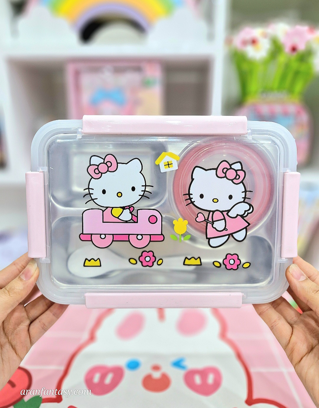 ظرف غذا استیل ۳۰۴ طرح کیتی با رنگ صورتی ملیح، دارای درب شفاف و سه بخش مجزا. یکی از بخشها شامل یک کاسه استیل دربدار است که به راحتی قابل جدا شدن است و حتی میتوان برش هم داشت. درب پلاستیکی سوپاپدار از نشت و ریختن محتویات جلوگیری میکند و یک قاشق سفید پلاستیکی کوچک نیز همراه ظرف ارائه شده است. طراحی فانتزی و کاربردی آن، این ظرف غذا را برای مدرسه، محل کار و پیکنیک مناسب میکند.